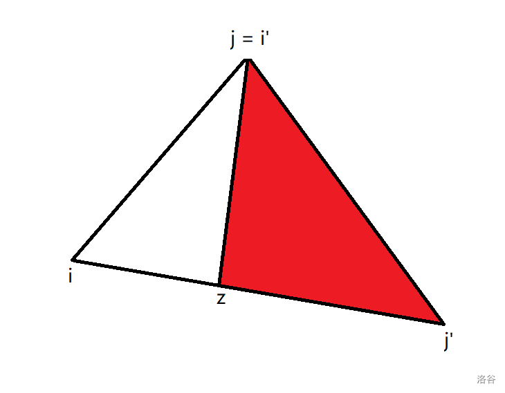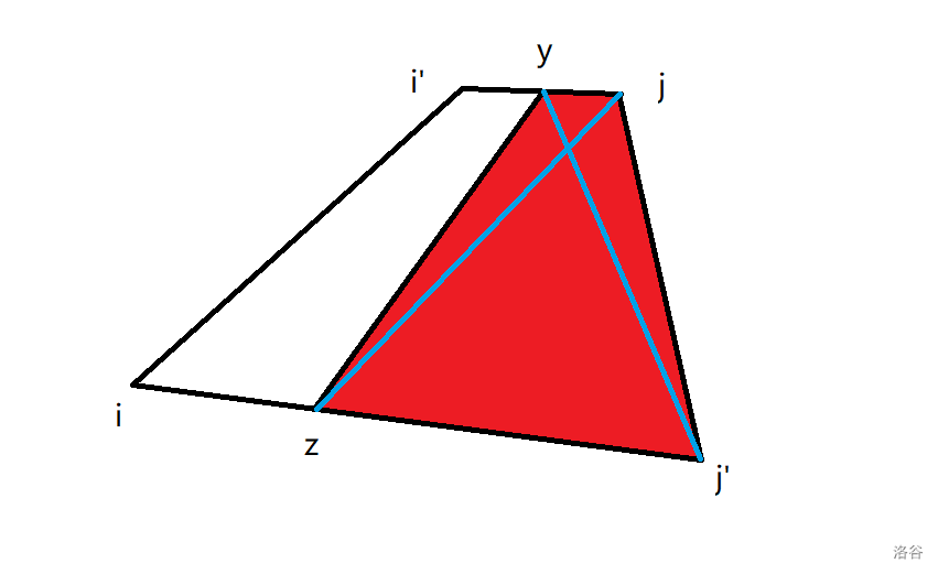 我们设 $c(i, j')$ 在 $k = z$ 处有最小值,记为 $c_z(i, j) = c(i, j) = w(i, j) + c(i, z) + c(z + 1, j)$。 现在有两个对称的情况,$z \leq j$ 和 $z \geq j$,我们只证明 $z \leq j$ 的情况,$z \geq j$ 同理可得。 考虑数学归纳法,我们先证明 $z \leq j \leq j'$ 时引理成立,此时我们设三角形三个顶点分别是 $i, j, j'$,它们之间的边长分别是 $c(i, j), c(j, j'), c(i, j')$,那么 $z$ 就是 $ij'$ 这条边上的一个最优分割点,于是我们可以画出下图:  在 $\triangle zjj'$ 中,$c(z, j) + c(j, j') \leq c(z + 1, j')$,这是反三角不等式此时满足引理 2.3.1。 我们考虑,$z$ 为 $i$ 到 $j'$ 的区间最优分割点,但有可能是 $i$ 到 $j'$ 的最优分割点,因此 $c(i, j) \leq c_z(i, j) = w(i, j) + c(i, z) + c(z + 1, j)$。 我们把两边同时加上 $c(j, j')$,可以得到 $c(i, j) + c(j, j') \leq w(i, j) + c(i, z) + c(z + 1, j) + c(j, j')$。由于单调性 $w(i, j) \leq w(i, j')$,而根据之前求出的不等式 $c(z, j) + c(j, j') \leq c(z, j')$,可以得出 $c(i, j) + c(j, j') \leq w(i, j') + c(i, z) + c(z + 1, j') = c(i, j')$。 - $i < i' < j < j'$,此时是最普通的情况。假设小区间 $c(i', j)$ 和大区间 $c(i, j')$ 分别在 $k = y$ 和 $k = z$ 处取得最小值,记为 $c(i', j) = c_y(i', j) = w(i', j) + c(i', y) + c(y + 1, j)$,$c(i, j') = c_z(i, j') = w(i, j') + c(i, z) + c(z + 1, j')$。 现在又有两个对称的情况,$z \leq y$ 和 $z \geq y$,我们只证明 $z \leq y$ 的情况,$z \geq y$ 同理可得。 我们依然考虑数学归纳法,先证明边界情况,即 $z \leq y < j < j'$ 时引理成立。我们设四边形的四个顶点是 $i, i', j, j'$,它们之间的边长分别是 $c(i, j'), c(j, j'), c(i', j), c(i, i')$,那么 $y$ 就是 $i'j$ 这条边上的最优分割点,而 $z$ 就是 $ij'$ 这条边上的最优分割点,于是我们可以画出下图:  根据四边形不等式,$c(z, j) + c(y, j) \leq c(y + 1, j) + c(z + 1, j')$,此时满足引理 2.3.1。 依然考虑 $y$ 是 $i'$ 到 $j$ 的最优分割点,可能是 $i'$ 到 $j'$ 的最优分割点,因此 $c(i', j') \leq c_z(i', j')$,同理可得 $c(i, j) \leq c_z(i, j)$,于是将等式左边加起来,等式右边加起来,可以得到 $c(i, j) + c(i', j') \leq c_z(i, j) + c_y(i', j') = w(i, j) + w(i', j') + c(i, z) + c(z + 1, j) + c(i', y) + c(y + 1, j')$。 根据 $w$ 的单调性以及推出的 $c(z, j) + c(y, j) \leq c(y + 1, j) + c(z + 1, j')$,可以得到 $c(i, j) + c(i', j') \leq w(i', j) + w(i, j') + c(i, z) + c(i', y) + c(y + 1, j) + c(z + 1, j') = c(i', j) + c(i, j')$。