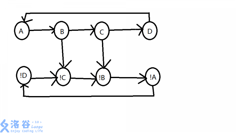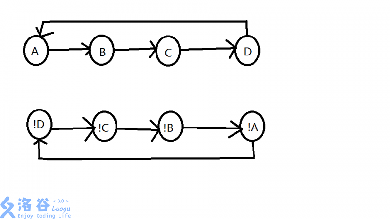 我们考虑这样一件事情:如果逻辑关系$A->B->C->D->A$存在,那么他们的“非”关系一定有$!D$$->$$!C$$->$$!B$$—>$$!A->!D$存在,如下图所示: