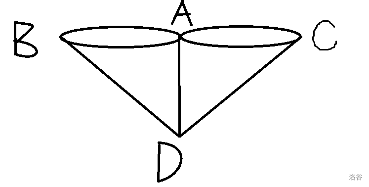 通过这样的改变,七桥问题便转化为只用一笔是否能够通过这七条线的问题。若可以画出来,则图形中必有终点和起点,并且起点和终点应该是同一点,由于对称性可知由 $B$ 或 $C$ 为起点得到的效果是一样的,若假设以 $A$ 为起点和终点,则必有一离开线和对应的进入线,若我们定义进入 $A$ 的线的条数为入度,离开线的条数为出度,与 $A$ 有关的线的条数为 $A$ 的度,则 $A$ 的出度和入度是相等的,即 $A$ 的度应该为偶数。即要使得从 $A$ 出发有解则 $A$ 的度数应该为偶数,而实际上 $A$ 的度数是 $5$ 为奇数,于是可知从 $A$ 出发是无解的。同时若从 $B$ 或 $D$ 出发,由于 $B$ 、 $D$ 的度数都是 $3$ ,都是奇数。所以这个七桥问题就是无解了。