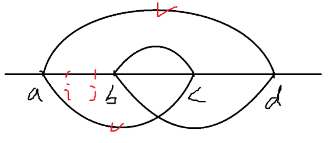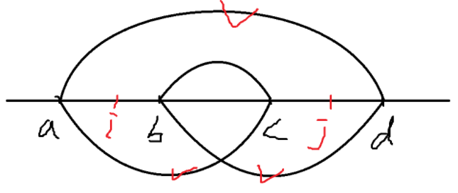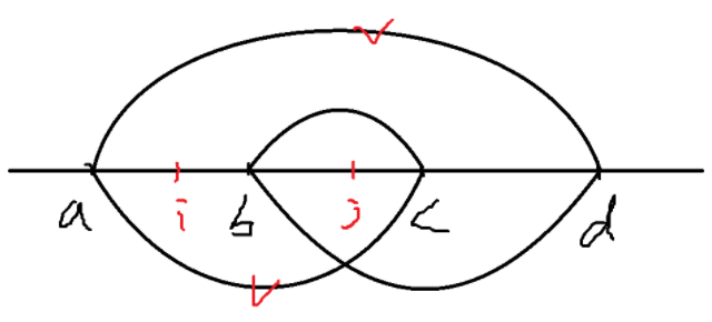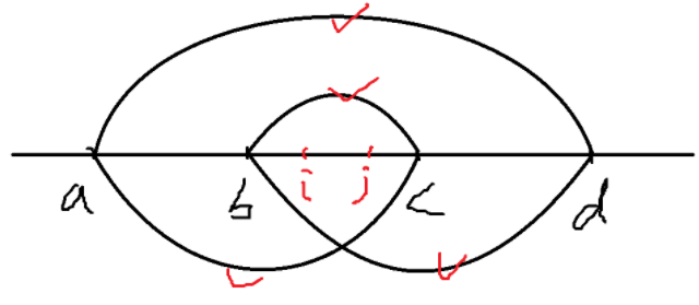 我们考虑四个点 $a < b < c < d$。如果 $(i, j)$ 是一个逆序对,我们分类讨论它们的位置,以及对交叉和包含两种情况的贡献:
