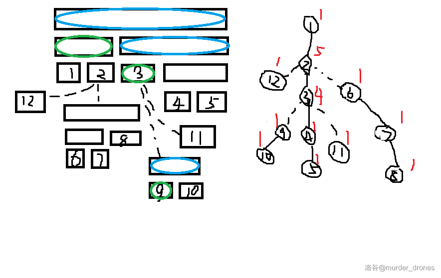 每次的操作是重链的一段前缀。以 9 号点为例,其需要计入答案的节点用绿色圈出,会经过但不算答案的点用蓝色圈出。(去原树看看也确实是 1,2,3,9 在其到根路径上。)