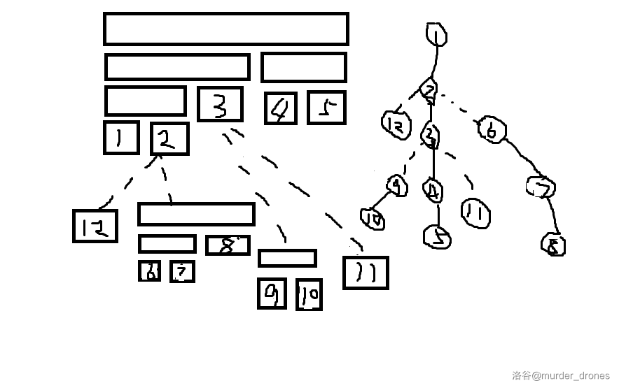 具体地,一个点的子树在 dfn 序上的范围是 $[dfn_x,dfn_x+sz_x-1]$,我们把两种操作都对应成了区间操作,这里和树剖是类似的。
