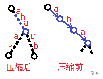 注意,我们手中的后缀树是压缩的。也就是说,每个点不仅仅表示一个字符串,而是压缩前后缀树中,不分叉父边上的所有串(蓝色部分)。