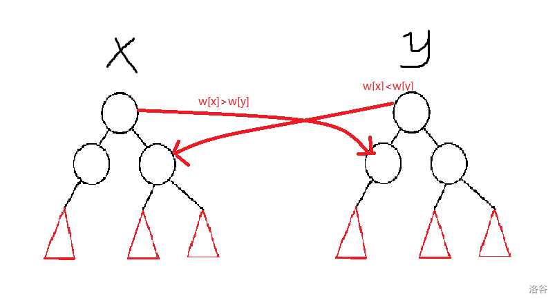 $\text{merge}$ 函数的作用是将两颗树合并的函数,以下是一种常见的写法(这里保证 x 的权值小于 y 的权值)。