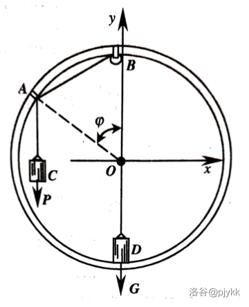 **例 3.3** 如图,大圆环光滑,$A$ 为光滑小环,其上系两段绳子。$B$ 为光滑定滑轮,大小不计,两物体 $C,D$ 重力分别为 $P,G$,$D$ 与大圆环间无弹力。求平衡时的 $\varphi$ 及平衡稳定性。