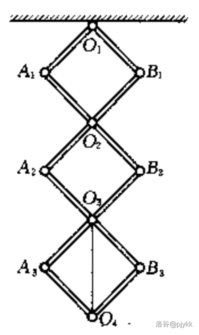 **例 1.3** 如图由四根长 $L$ 重 $mg$ 的杆和四根长 $2L$ 重 $2mg$ 的杆光滑铰接而成,杆间夹角均为直角。一根不可伸长的细绳连接两铰接点,求细绳的拉力 $T$。