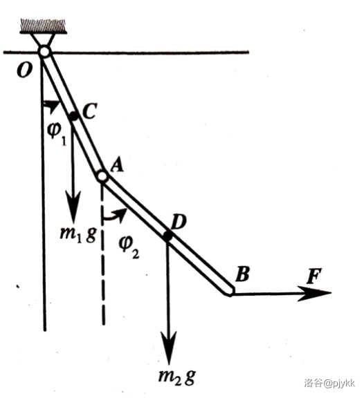 **例 2.** 如图,杆 $OA,AB$ 长度分别为 $l_1,l_2$,各铰接处光滑,求 $\varphi_1,\varphi_2$。