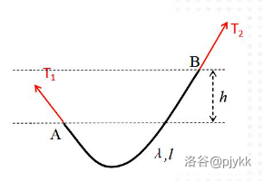 **例 1.1** 如图,现有线密度为 $\lambda$ 的均质链条,它静止悬挂时两端各受的力为 $T_1,T_2$,两端高度差为 $h$。证明 $T_2-T_1=\lambda gh$.