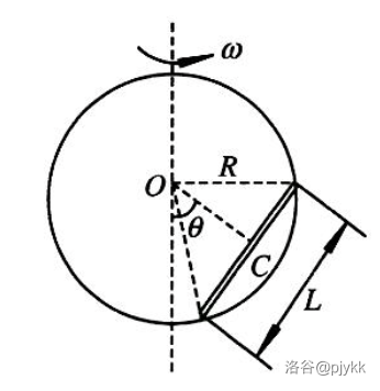 **例 3.4** 如图,光滑圆环半径为 $R$,以 $\omega$ 角速度匀速转动。一根长 $L=\sqrt{2}R$ 的细杆放于环上,杆中心与圆心的连线与竖直方向夹角为 $\theta$。求平衡时 $\theta$ 大小,并讨论平衡稳定性。