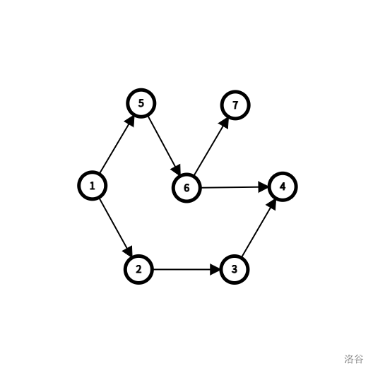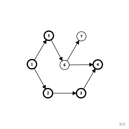 但是由于节点 $6$ 指向的节点 $7$ 不能到达终点 $4$,因此节点 $6$ 也不能作为最短路径上的点。