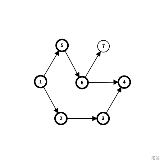 接下来我们从终点 $4$ 反向搜索,发现只有节点 $1,2,3,4,5,6$ 可以到达终点 $4$。