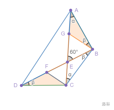 在\triangle BEC 中,\angle ECB + \angle EBC = \angle AEB ,即\alpha + \beta = \angle AEB = 60\degree ;