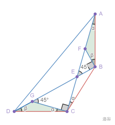 解:向右构造等腰直角三角形AEF ,易得E,B,F 共线;作GC\perp BD 于D .