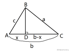 设 $BD=x,CD=b-x$。由勾股定理得 $c^2-x^2=a^2-(b-x)^2$。解得 $x=\dfrac{b^2+c^2-a^2}{2b}$。