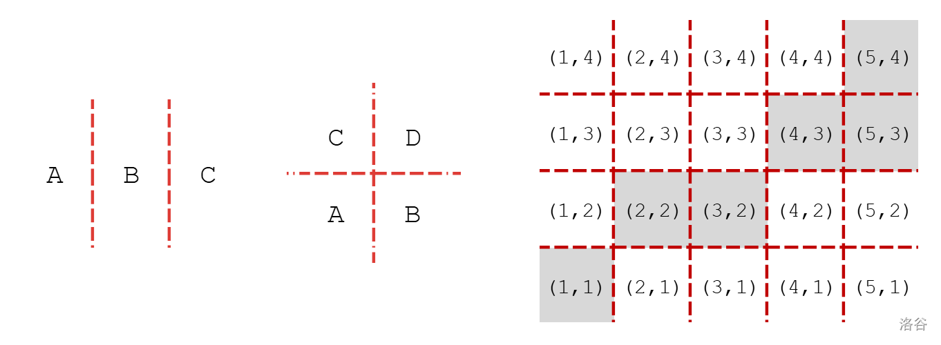 类似的,如果垂直 $x$ 轴划了 $a$ 刀,垂直 $y$ 轴划了 $b$ 刀,所有点会被划分成 $(a+1)(b+1)$ 部分。我们按照图示方法记录每个部分为一个二元组 $(i,j)$。
