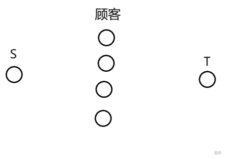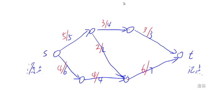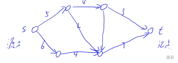 其中 $s$ 为源点,$t$ 为汇点,边上的数字为容量。