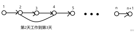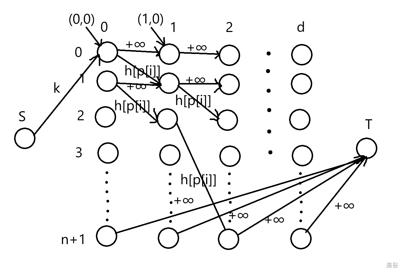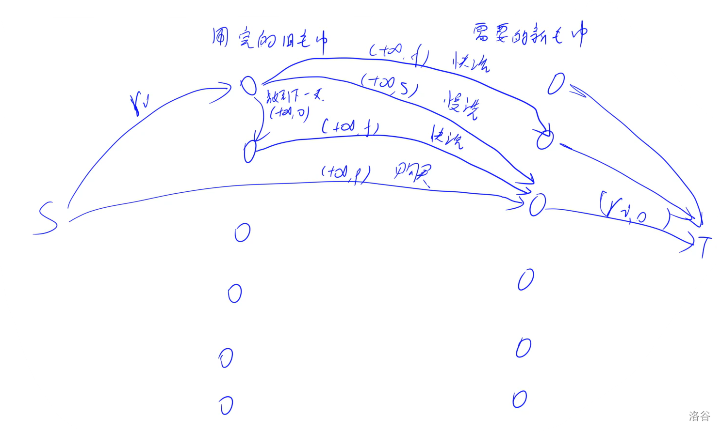 如果一个志愿者能从第 $S_i$ 天工作到第 $T_i$ 天,就让第 $S_i$ 条边到第 $T_i$ 条边流 $1$ 的流量。但是我们要保证流量守恒,所以从第 $T_i+1$ 个点向第 $S_i$ 个点连一条容量为 $+\infty$,费用为 $C_i$,下界为 $0$ 的边,让这个流量流回去,那么这条边的流量就等于这类志愿者使用了多少人。其他边的容量为 $+\infty$,费用为 $0$,下界为 $A_i$。