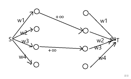 考虑到原问题的费用在点上,所以我们进行拆点,入点向出点连一条费用为 $w_{i,j}$,容量为 $1$ 的边,但是如果单纯是这样的话,这个点只能走一次,而原问题是:可以走很多次,但是只有一次能累加费用,所以我们再从入点向出点连一条容量为 $+\infty$,费用为 $0$ 的边。然后直接求最大费用最大流。