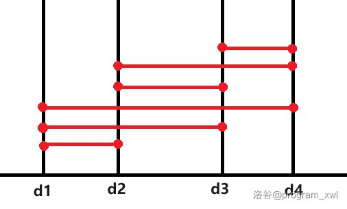 它肯定不能只记下一种余数第一次出现的和最后一次出现的,它需要求合法的方案数。在这题中,我们需要统计每种余数出现的个数,来计算配对的方案数。但这个方案数有个坑,设有 $4$ 个点的前缀和模 $k$ 的结果相同,这些点分别用 $d1,d2,d3,d4$ 来表示,则配对情况如下图。