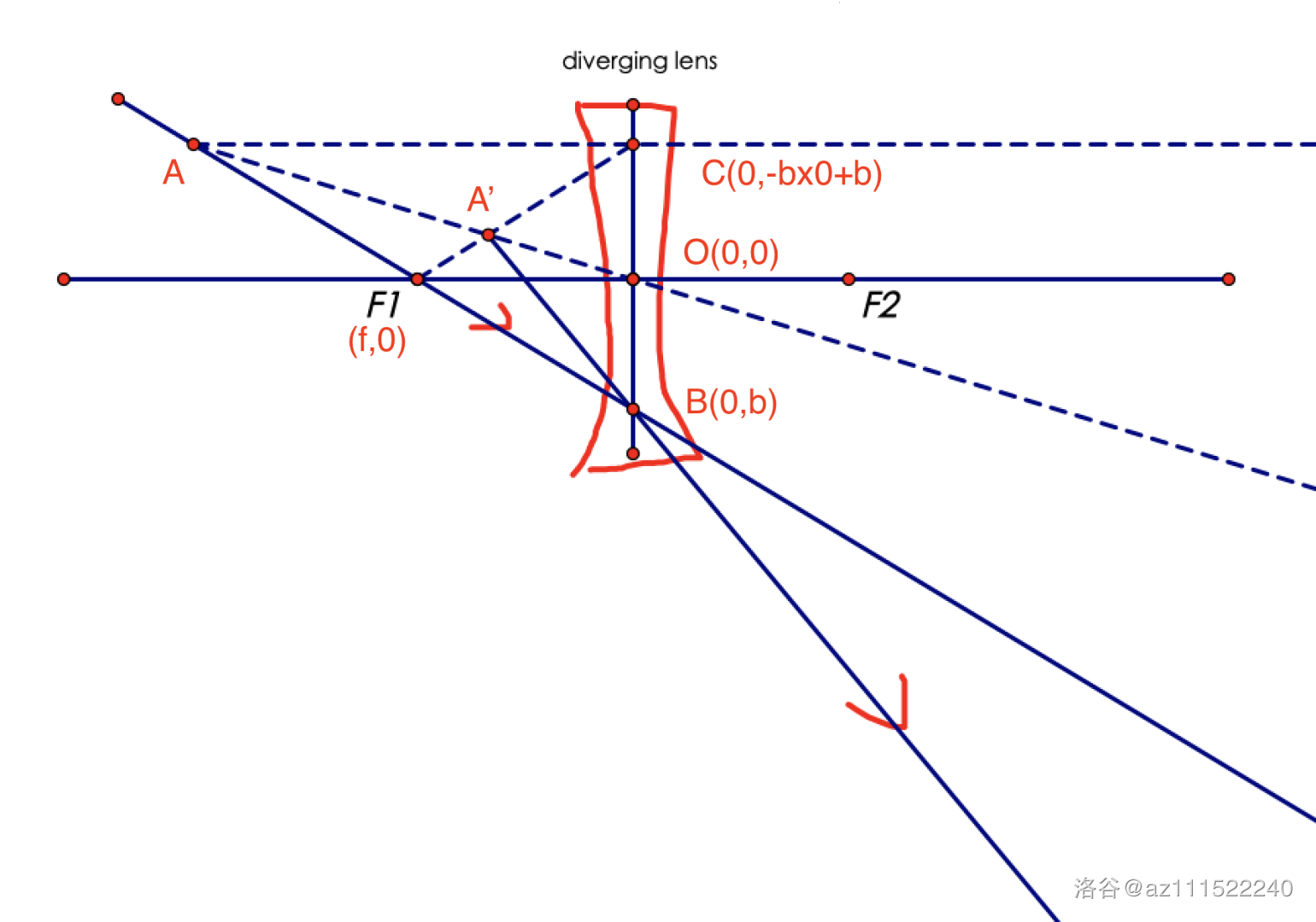 the ray emitted is A'B:y=\dfrac{-2b}{f}x+b, which is totally indipendent with A, or x_0