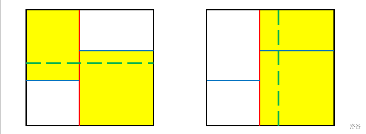 设 $f(l_0,r_0)$ 为区间 $[l_0,r_0]\ (l\leq l_0\leq mid< r_0\leq r)$ 最大点权独立集,那么有:$f(l_0,r_0)=\max(a_{l_0}+d_{r_0},b_{l_0}+c_{r_0})$。