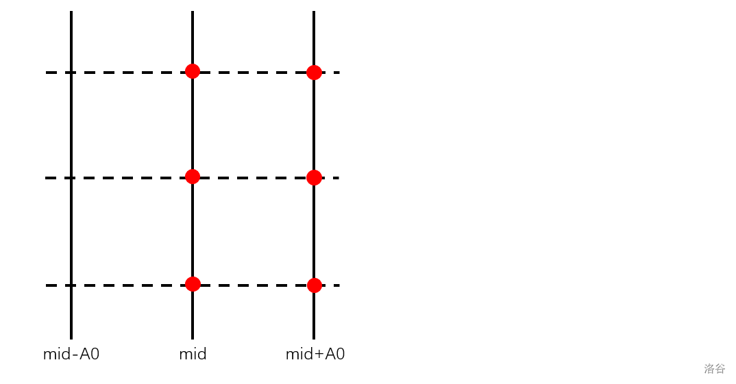 我们只取中点所在横坐标两侧 $A_0$ 范围内的点(如图左右两条线之间),枚举一个左侧点 $p_i$,然后只考虑纵坐标与其差不超过 $A_0$ 的点,由于右侧任意两点距离不小于 $A_0$,所以根据简单的抽屉原理可知这样的点最多有六个(如图中六个红点),所以依次枚举是可以接受的。