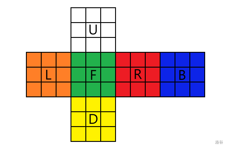例如,进行一次 $\texttt{UR}$ 操作(意思为先顶面顺时针转动 $90^\circ$,然后右面顺时针转动 $90^\circ$。转动表示详见 [Part 1](https://www.luogu.com.cn/article/yc1aq0gv)),