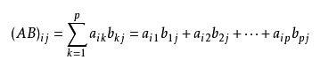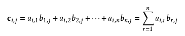 设A为 m × q 的矩阵,B为 q × n 的矩阵,那么称 m × n 的矩阵**C**为矩阵**A**与**B**的乘积,记作 _**C**=**AB**_ ,其中**矩阵C**中的第 _i_ 行第 _j_ 列元素可以表示为: