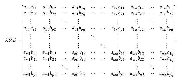 _m × n_ 的矩阵 **_A_** 与 _p × q_ 的矩阵 _B_ 的克罗内克乘积记为 _A $\bigotimes$ B_ , _A $\bigotimes$ B_ 是一个 _mp*nq_ 的矩阵,克罗内克乘积也被称为直积或张量积。