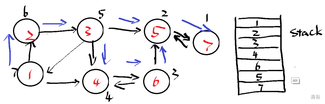 第一遍 $\texttt{Dfs}$ 先在原图中求出每个点的时间戳,并将其压入栈中: