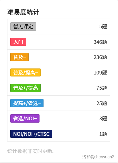 |**洛谷难度**|$\color{ffc116}\texttt{普及/提高-}$|$\color{9d3dcf}\texttt{省选/NOI-}$|$\color{0e1d69}\texttt{NOI/NOI+/CTSC}$|$\color{0e1d69}\texttt{NOI/NOI+/CTSC}$|