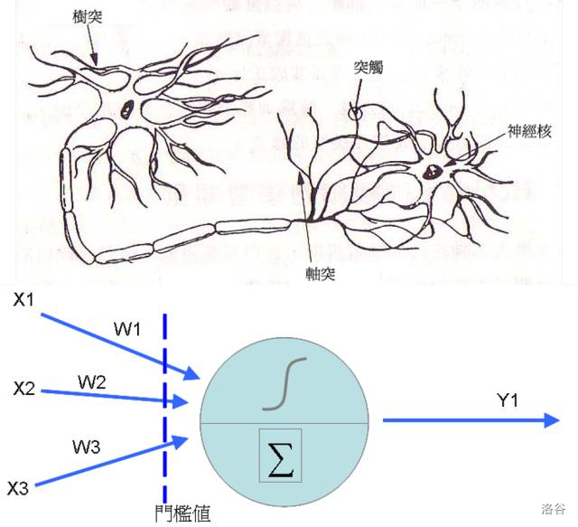 其实类神经网络是很古老的技术了,在$\text{1943}$年,$\text{Warren McCulloch}$以及$\text{Walter Pitts}$首次提出神经元的数学模型,之后到了$\text{1958}$年,心理学家$\text{Rosenblatt}$提出了感知器($\text{Perceptron}$)的概念,在前者神经元的结构中加入了训练修正参数的机制(也是我们俗称的学习),这时类神经网络的基本学理架构算是完成。类神经网络的神经元其实是从前端收集到各种讯号(类似神经的树突),然后将各个讯号根据权重加权后加总,然后透过活化函数转换成新讯号传送出去(类似神经元的轴突)。