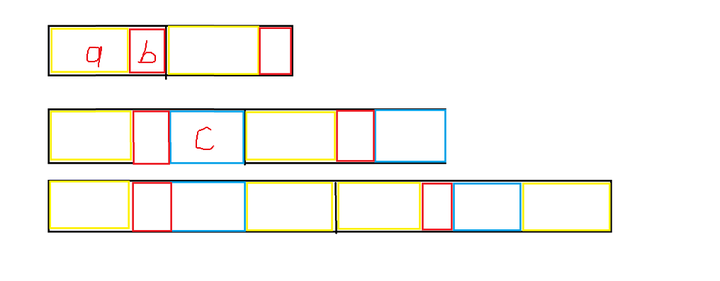黄色框代表串 $a$ 长度为 $|w|-|v|$,红色框代表串 $b$ 长度为 $|u|-(|w|-|v|)$,蓝色框代表串 $c$ 长度为 $|v|-|u|$。然后从图中可以得到的的是 $c$ 是 $ab$ 的前缀,$bc$ 是 $ab$ 的前缀。所以 $c$ 是 $bc$ 前缀,然后不难得到 $|b|$ 是 $bc$ 的周期,由于 $u$ 有长度为 $|v|-|u|$ 的周期而且 $c$ 和 $bc$ 都是 $u$ 的前缀,所以 $|c|$ 也是 $bc$ 的周期。不难得到 $\gcd(|b|,|c|)$ 也是 $bc$ 的周期。然后由于 $|a|$ 也是 $u$ 的周期所以 $\gcd(|a|,|b|,|c|)$ 也是 $bc$ 的周期,不难得到 $\gcd(|a|,|b|,|c|)$ 也是 $u$ 的周期。所以 $u$ 不是本原平方串。