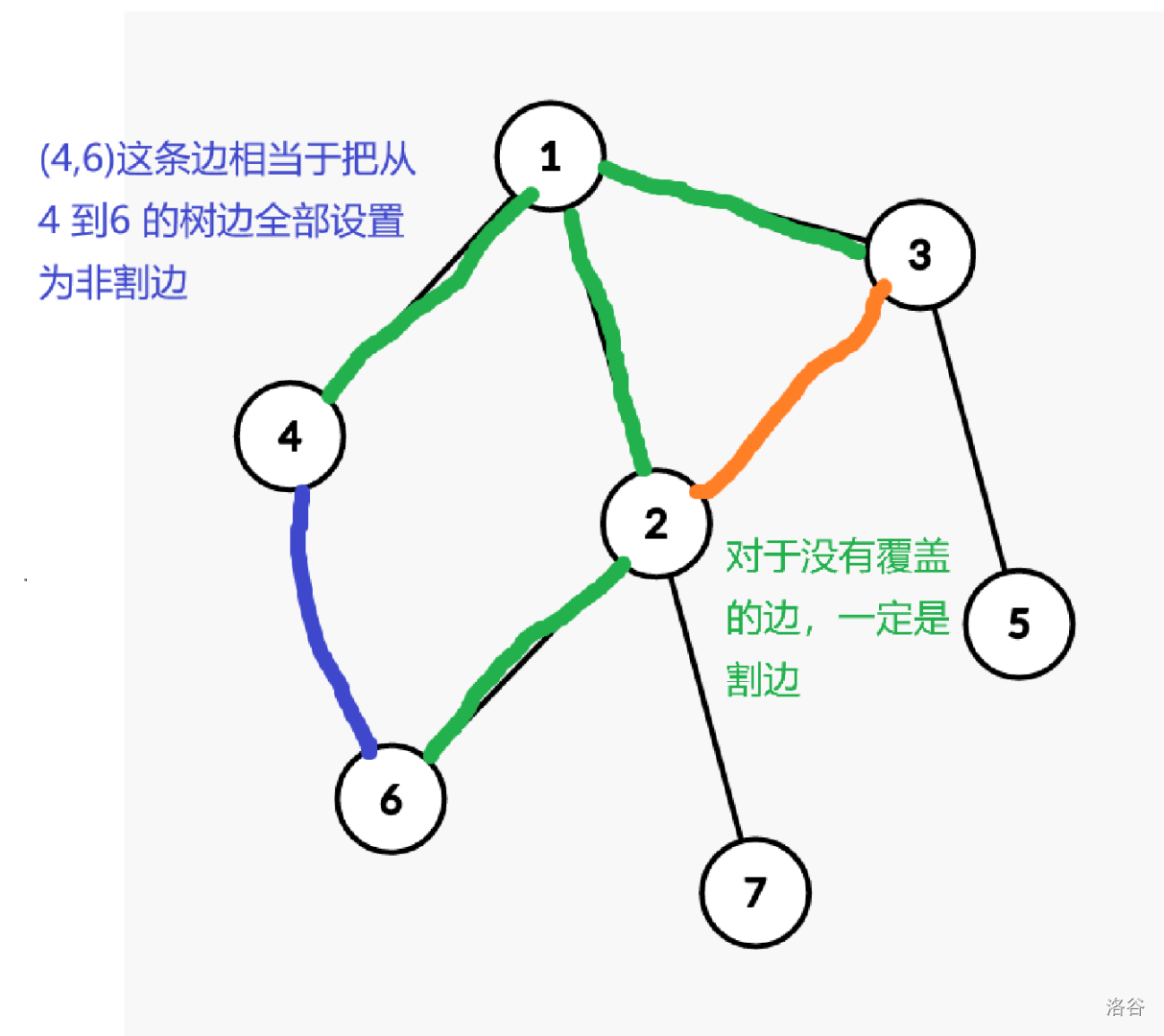 观察一条非树边对答案贡献了什么。容易发现,一条非树边 $(u,v)$ 就是把树上从 $u$ 到 $v$ 的路径全部设为非割边。就像这样: