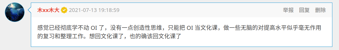 大概从这时起,我面对 $\text{OI}$ 的心情沉重起来,这是一条太残酷的路。我开始关注 $\text{OIer}$ 们,那些挥洒过爱和泪的,那些走到过巅峰的或遗憾离开的。我喜欢看别人的游记,看他们除了 $\text{OIer}$ 的身份以外是怎样的人,看他们如何一步一步地向前走,领略各种各样的 $\text{OI}$ 情怀。这个习惯一直保持到现在。